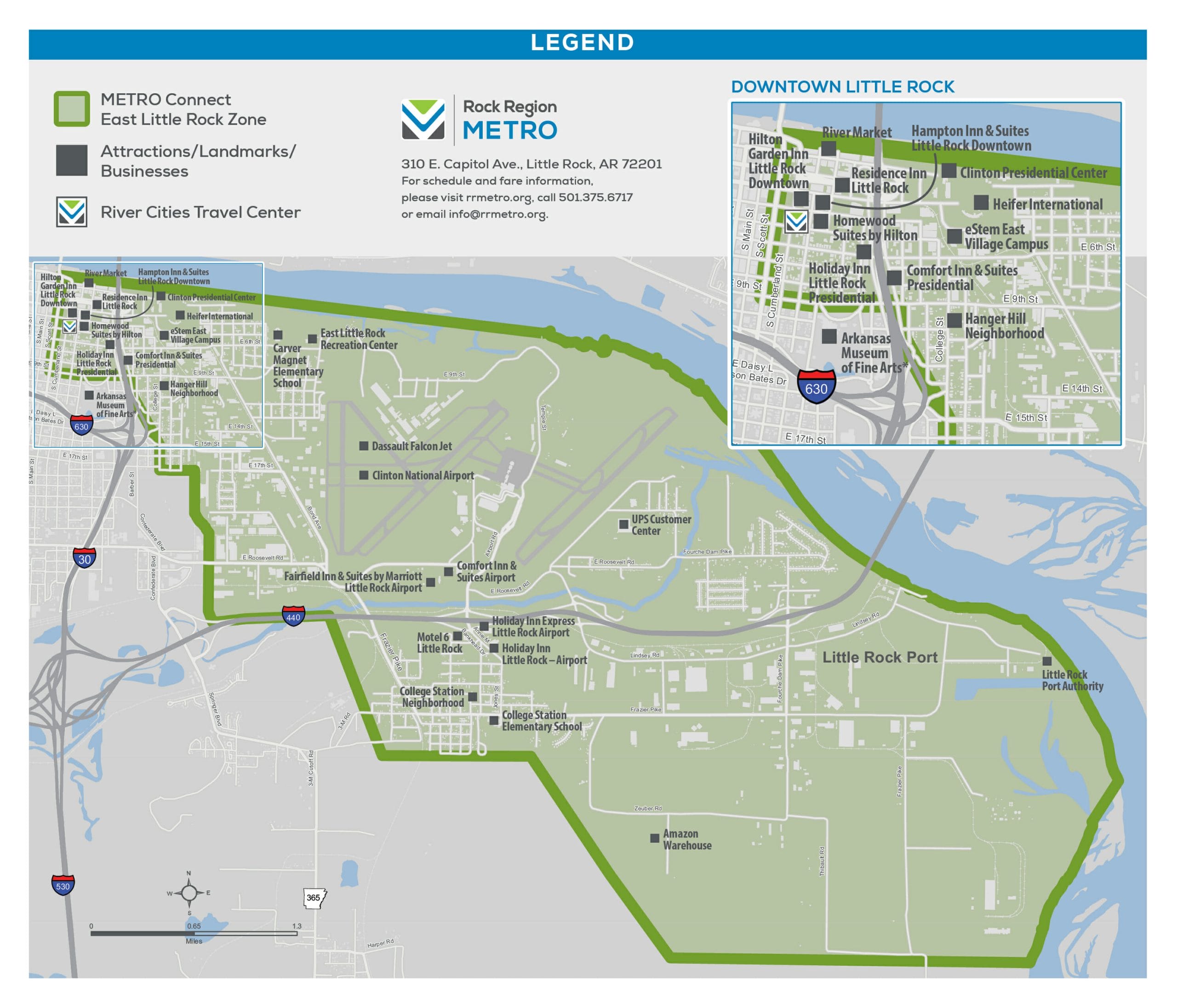 The expanded East Little Rock Zone, which has been operating as the Temporary Airport/Port/Shorter College Zone, will shed the Shorter College service area (that area will spin off into a separate microtransit zone) and will expand further south to include Zeuber Road in the Little Rock Port Authority, which is where the Amazon campus is. The Amazon campus is a current point of interest in the current Temporary Airport/Port/Shorter College Zone. The East Little Rock Zone includes most of the area served by the former Routes 12 Clinton Center/Airport and 20 Hanger Hill/College Station, with point-to-point service to several downtown and airport area hotels, the UPS Customer Service Center and businesses within the Little Rock Port Authority. Operating hours as of Monday, June 20, 2022 will be Monday-Friday, 5 a.m.-8 p.m. and Saturday-Sunday, 8 a.m.-5 p.m. The Amazon center on Zeuber Road will be within the expanded zone and will therefore be removed as a point of interest. Riders will still be able to book trips from within the East Little Rock Zone to the Amazon center on Zeuber Road. The Kroger on Roosevelt will be added as a point of interest to the East Little Rock Zone.