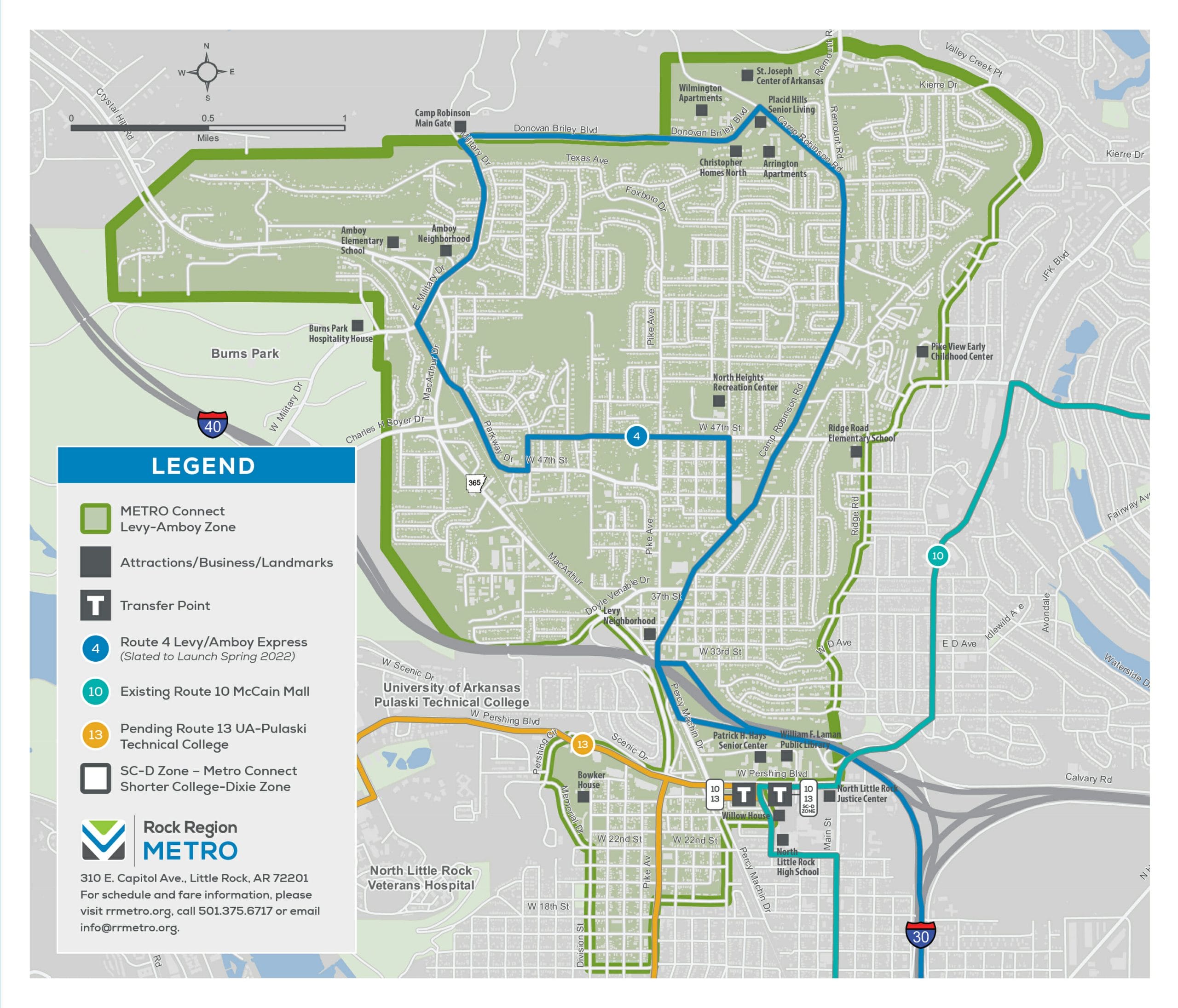 The pending new METRO Connect Levy-Amboy Zone includes most of the North Little Rock area served by the former Route 4 Levy-Amboy regular, non-express fixed route, with point-to-point service to several area residences and schools, St. Joseph Center of Arkansas, the Camp Robinson Main Gate, Burns Park Hospitality House and public centers. Operating hours as of Monday, June 20, 2022 will be Monday-Friday, 5 a.m.-8 p.m. and Saturday, 8 a.m.-5 p.m. The North Little Rock Justice Center, the intersection of Pershing & Willow in North Little Rock and the southwest corner of the intersection of JFK & Main Street will be added as points of interest to the zone.