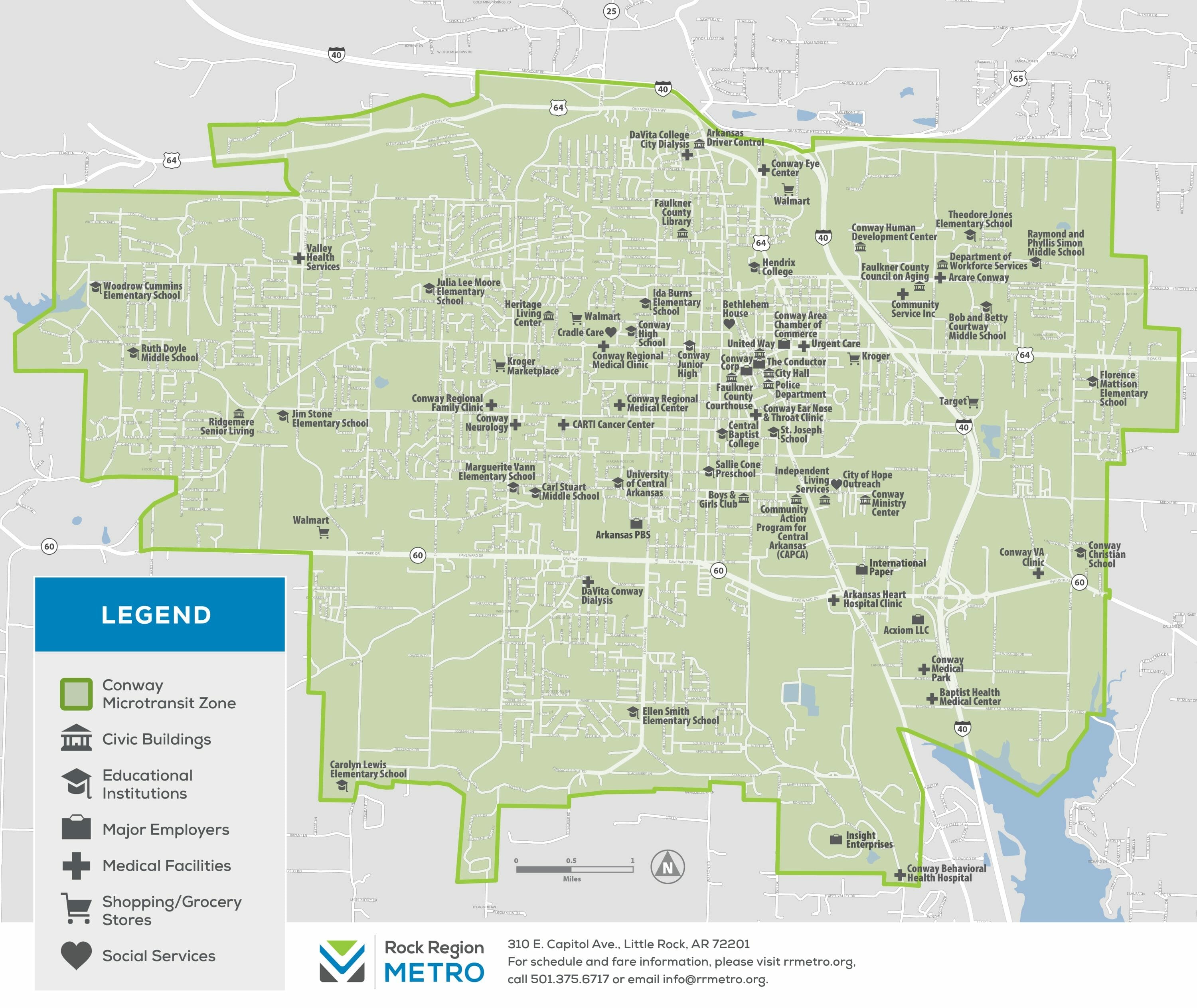 The METRO Connect Conway Zone has boundaries that closely mirror that of the city’s boundaries and therefore has no “points of interest” outside the main zone to and from which riders may travel. Click here to see the METRO Connect Conway Google map.